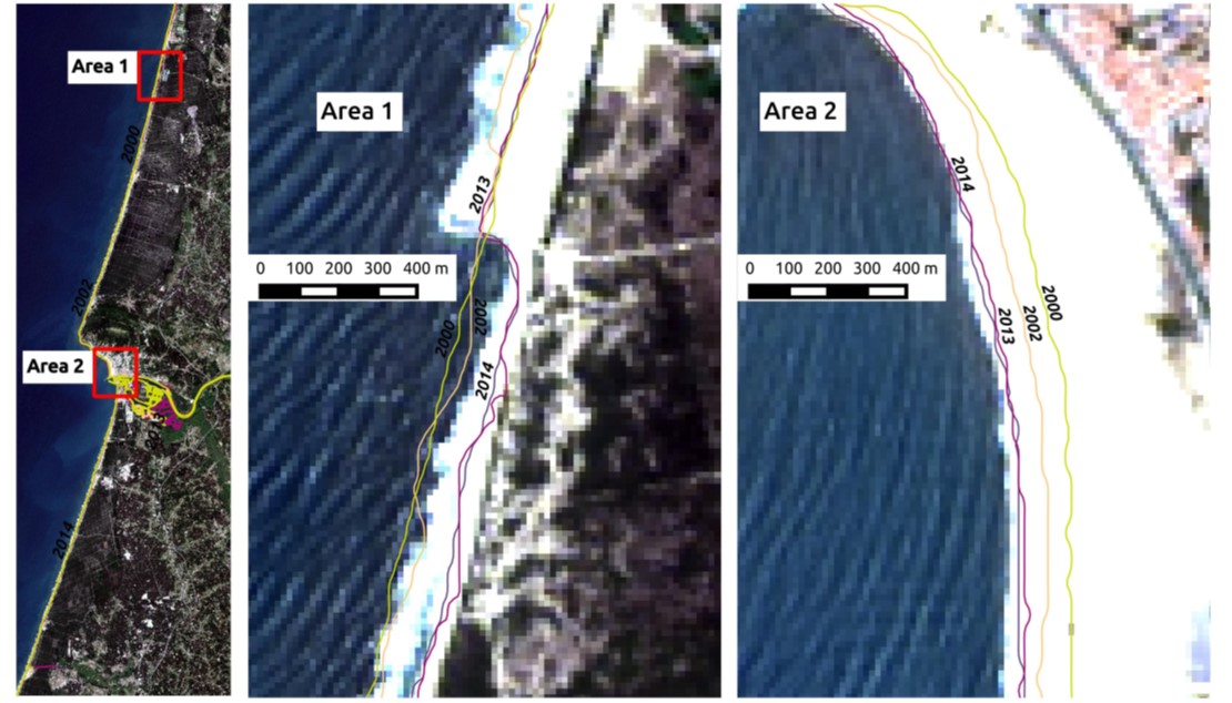 The analysis of the extracted shorelines for the years 2000, 2002, 2013, and 2014 identified areas of erosion (Area 1) and acression (Area 2).