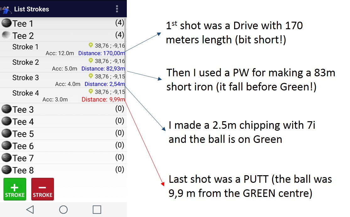 Golfers often wants to know how long was their shot, specially their Drive shot. The APP provides a list of distances of your shots during the game.