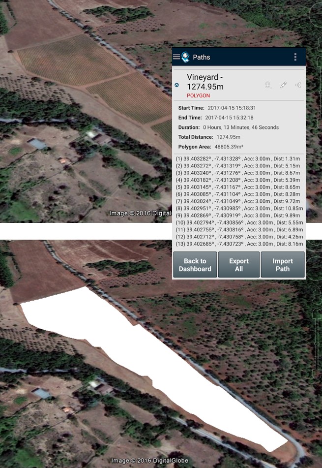 The GPS Waypoints is being used in Agriculture for both planning and monitor cultivated areas. It is used to measure crops areas in order to estimate production (create Manual Polygons), measure and plot new tubing layouts of sugar maple trees pipes (create Manual Paths), identify and classify the infested trees on olive groves or cork farms (Use custom tags and photo attachment).