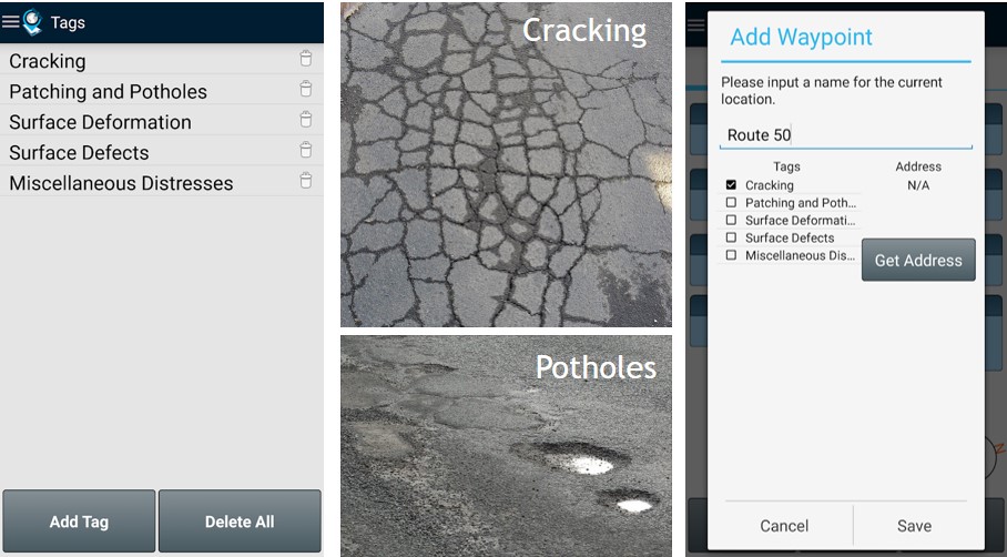 The road pavement maintenance professionals need to evaluate and classify the road status. They can identify pavements distresses with exact coordinates of the failures and associate a tag based on their own classification model. The model can be adapted for each country, using different levels of detailed. For instance, pavement distress model for asphalt concrete surfaces could be as simple as:
